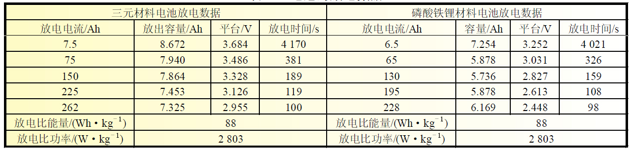 从图1 与表1 可得出,相同体积电池,正极使用三元材料比使用磷酸铁锂材料放电容量高19.4%,比能量高37.5%,放电比功率高39.7%。由于三元材料质量比容量、压实密度均高于磷酸铁锂材料,所以使用三元材料电池放电有较大优势。