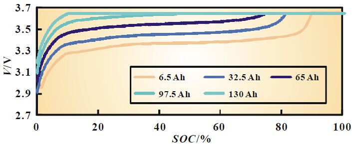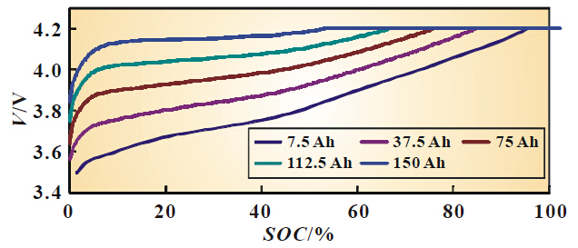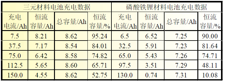 从图2 和表2 可见,三元材料电池与磷酸铁锂材料电池在不大于10 C 充电时,恒流充电容量/ 总容量比例无明显差距,10 C 以上倍率充电时,磷酸铁锂电池恒流充电容量/ 总容量比例较小,充电倍率越大,恒流充电容量/ 总容量比例与三元材料电池差距越明显,这主要与磷酸铁锂在30%~80%SOC 是电压变化较小有关,如负极使用软碳或硬碳,磷酸铁锂电池大倍率充电性能够达到三元电池的水平。