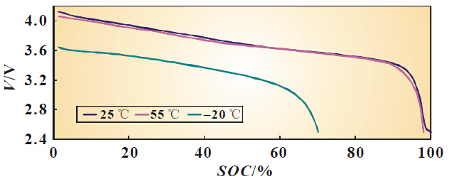 不同温度电池的放电比较如图4 所示。在55 ℃条件下放电,三元材料电池与磷酸铁锂在常温下比较,放电容量都没有差别,-20 ℃条件下放电,三元材料电池放电容量/ 常温容量比例比磷酸铁锂电池高15%,如表3 所示。